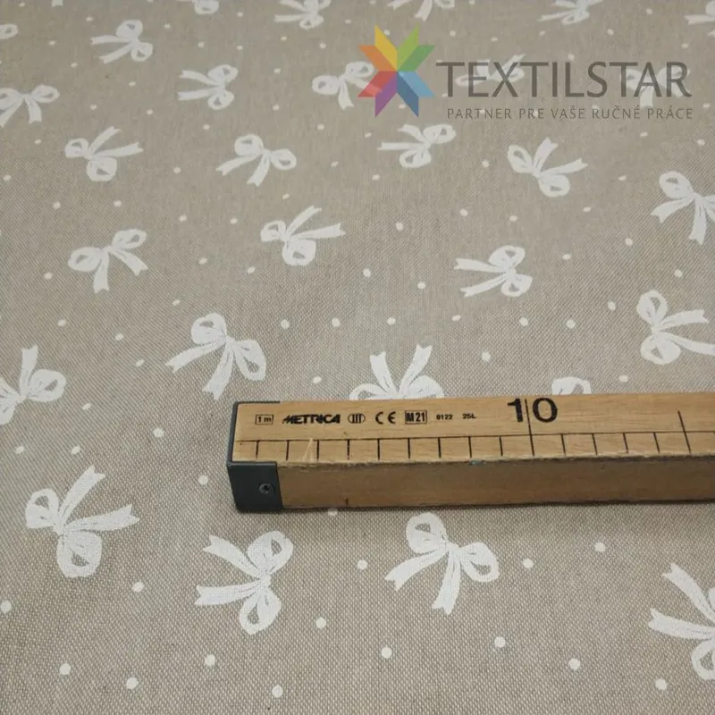 Dekoračná látka biele mašličky na režnom podklade